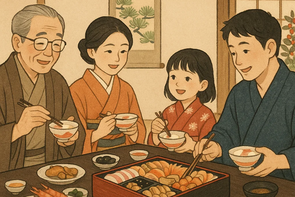 Le Nouvel An japonais est donc l’occasion idéale pour organiser de grands repas. On y organise des activités traditionnelles, joue à des jeux de société, ou encore échange des cartes de vœux (年賀状, Nengajô). De cette façon, les coutumes et les histoires familiales se transmettent de génération en génération.