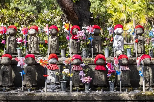 Au Japon, tout le monde connaît Jizo, figure importante du bouddhisme japonais qui a réussi à atteindre l’éveil. Ce protecteur des enfants assure leur sécurité dans les Enfers bouddhistes contre les démons qui y habitent. Pour une plus grande protection, les parents victimes d’une fausse couche ou d’un décès à la naissance habillent les statues Jizo. Ils leur font porter un bavoir et un bonnet rouges, symboles de protection de la vie de l’enfant devenu un symbole de Jizô également.