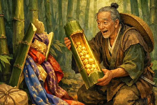 Il était une fois, un vieux coupeur de bambou du nom de Taketori no Okina qui se rendait dans la forêt pour y travailler. Couper cette plante était pour lui le seul moyen de subvenir à ses besoins. Un jour, il aperçoit une lumière au loin alors qu’il était en train de travailler.