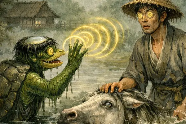 Dans la prĂ©fecture de Saga, Ă lâĂ©poque dâEdo, un fermier local du nom de Genta conduit son cheval prĂšs dâune riviĂšre. Ne sachant pas que les eaux Ă©taient habitĂ©es par des monstres, il surprend un kappa en train dâhypnotiser son serviteur.