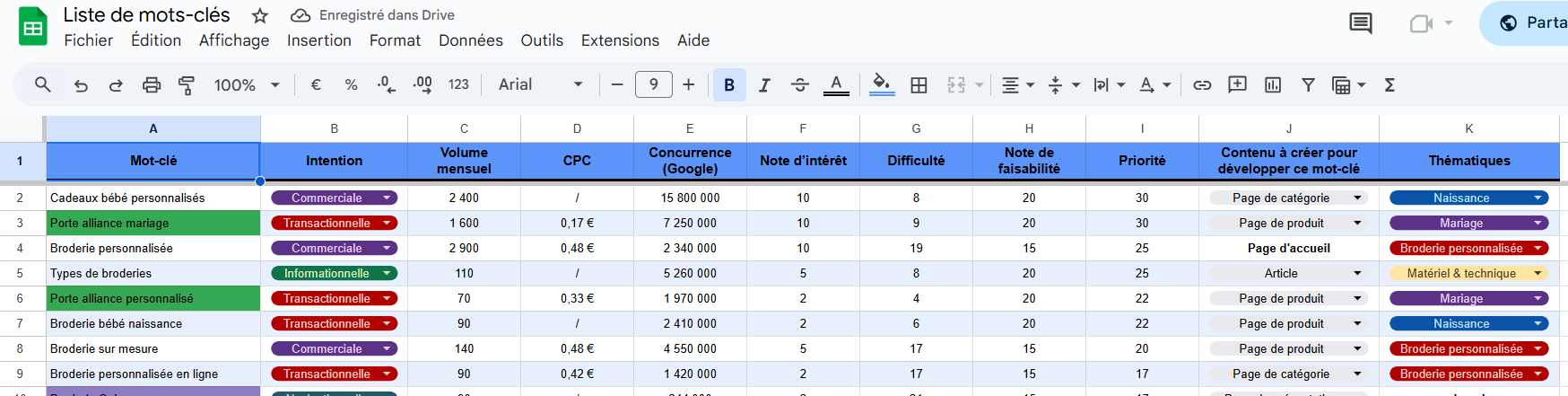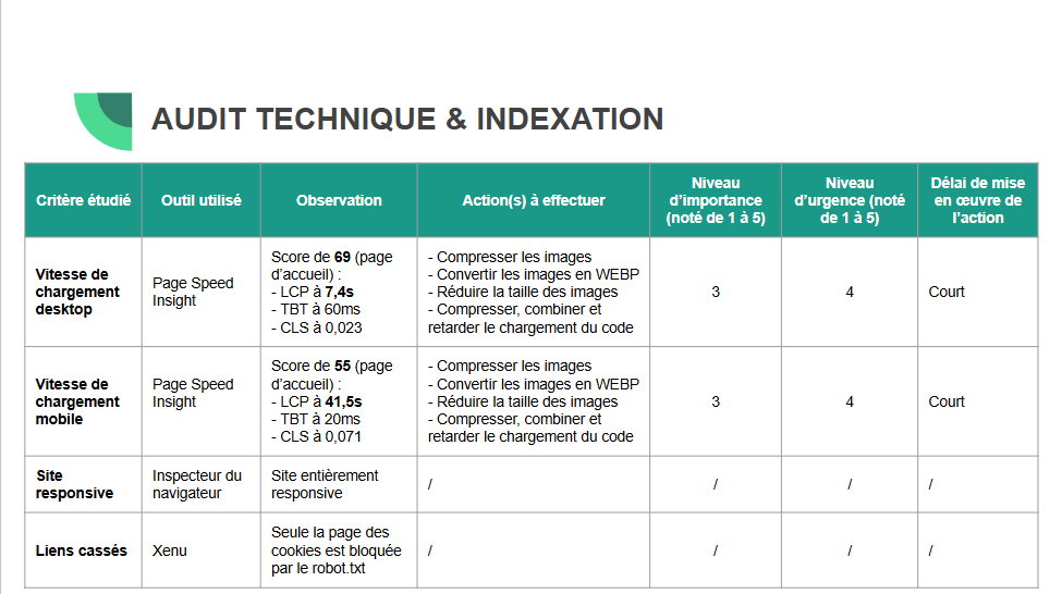 Ci-dessous, je donne trois exemples de ce que j’ai pu réaliser durant cette formation. J’ai travaillé sur un cas réel et voici une partie de la stratégie de mots-clés mise en place, un brief éditorial pour une page spécifique, ainsi qu’une partie de l’audit technique du site étudié.