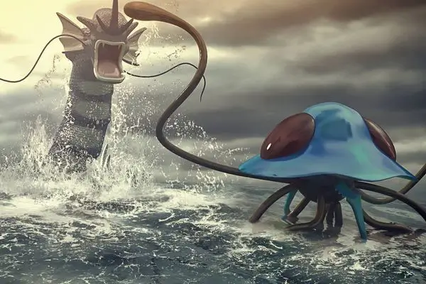 Dans Pokémon, c’est le dragon légendaire Lugia qui le représente. Il vit au fond des océans et symbolise la puissance maritime. On peut également faire le parallèle avec Léviator, possédant un long corps de serpent et des moustaches, Pokémon de type eau.