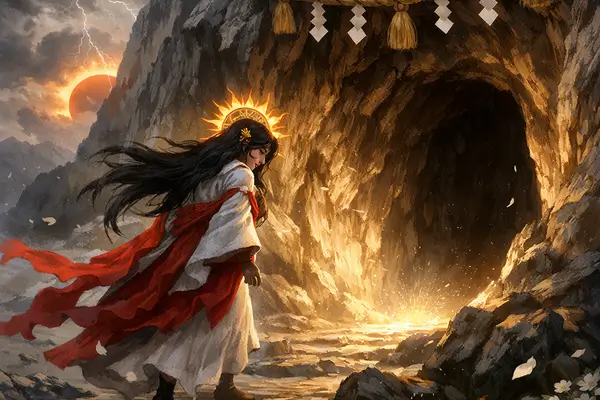 La déesse du soleil Amaterasu est tellement énervée, saoulée, triste, apeurée, qu’elle s’isole dans une grotte céleste. Ce qui a pour conséquence de plonger le monde dans le noir car seul Tsukuyomi est présent dans les cieux. Après une stratégie mise en place par d’autres dieux (lisez l’article sur Amaterasu), le soleil revient à son poste, la Terre est de nouveau éclairée.