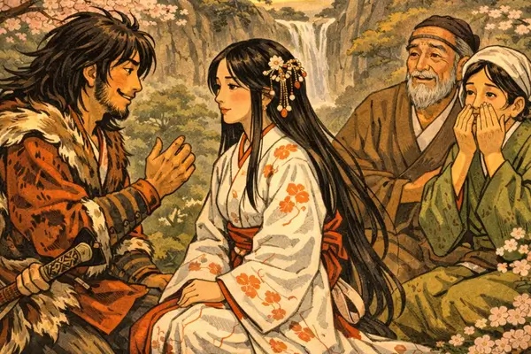 Le dieu des tempêtes et de la mer se retrouve donc à errer dans Izumo, jusqu’à ce qu’il tombe sur une famille à l’air désespérée. Le couple âgé serre fort leur fille dans leurs bras en pleurant. Susanoo no Mikoto leur demande ce qu’il se passe et on lui répond qu’un terrible dragon va bientôt débarquer. Chaque année, la créature dévore une fille, et cette année, c’est leur huitième et dernière fille que le dragon cible : Kushinada Hime.